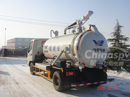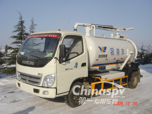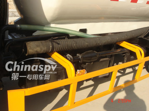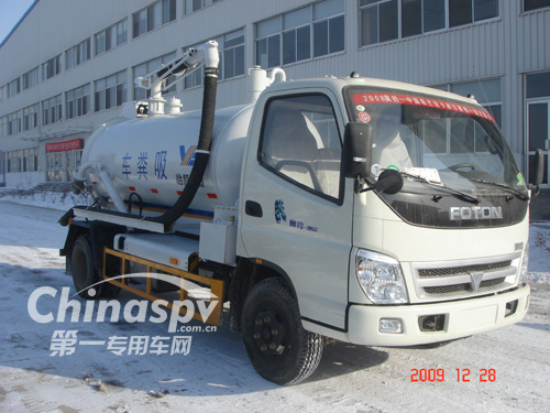 該吸污車由取力器、真空吸污泵、罐體、液壓部分,管網(wǎng)系統(tǒng)等組成,并裝有真空壓力表、視糞管,洗手水罐,抽吸吊桿總成等機(jī)構(gòu)。該車罐蓋的開(kāi)合鎖緊全部通過(guò)液壓系統(tǒng)實(shí)現(xiàn),操作快速簡(jiǎn)便。
